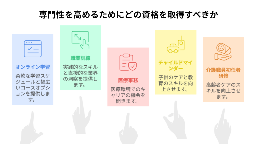 たとえば「医療事務」「チャイルドマインダー」「介護職員初任者研修」などは保育士経験との相性も良い資格です。オンライン学習や職業訓練を利用すれば、働きながらでも効率よく学べます。