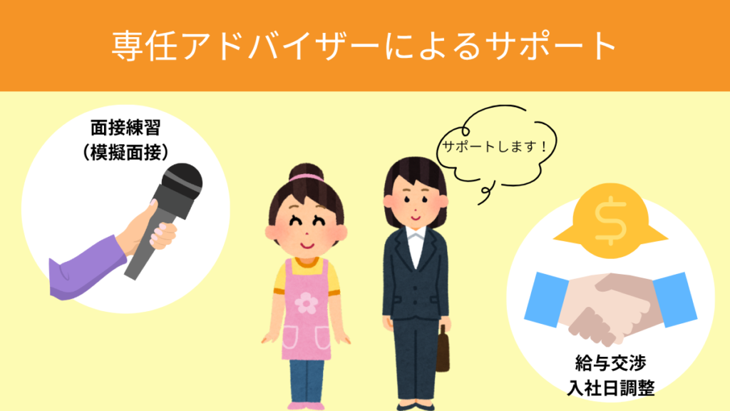 さらに、給与アップや入社日調整などの条件交渉もアドバイザーが代行します。