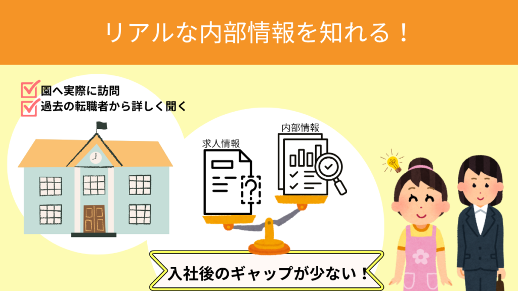 保育士ワーカーのアドバイザーは、園への直接訪問や過去の転職者からのヒアリングに基づき、職場の内部事情に精通しています。